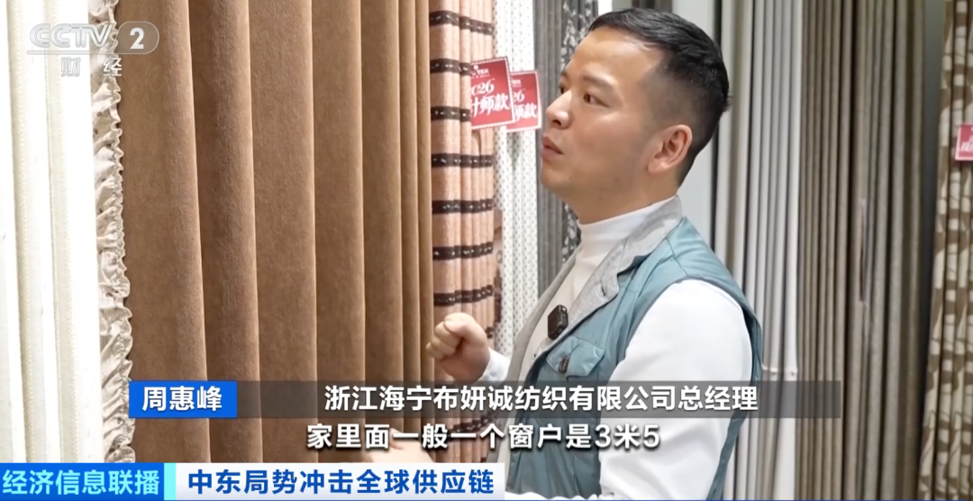 浙江海宁布妍诚纺织有限公司总经理周惠峰:一般一个窗户是3米5,窗帘需要用到7米面料,一个窗大概涨价150元。
