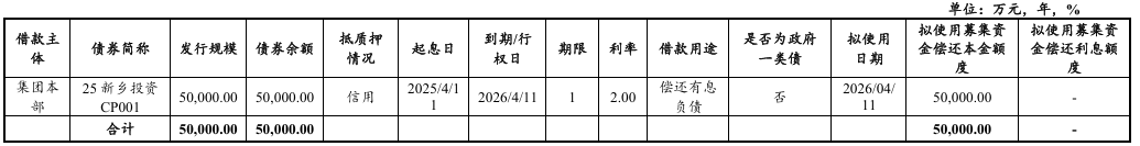 本期债券发行规模5亿元,期限1年,募集资金用于偿还存量融资工具“25新乡投资CP001”本金。
