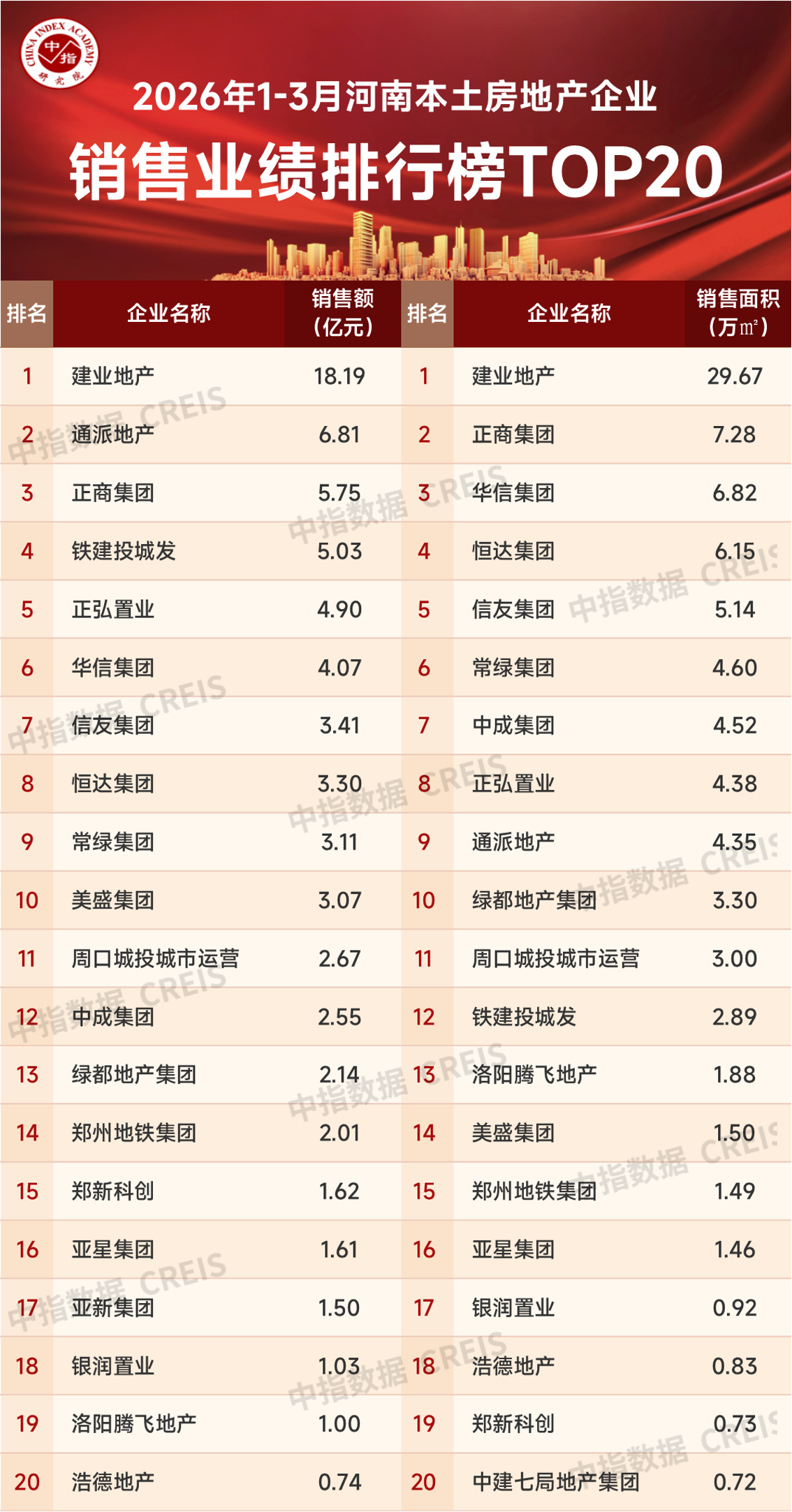 【大河财立方消息】4月8日,中指研究院发布2026年1~3月河南省房地产企业销售业绩TOP20。