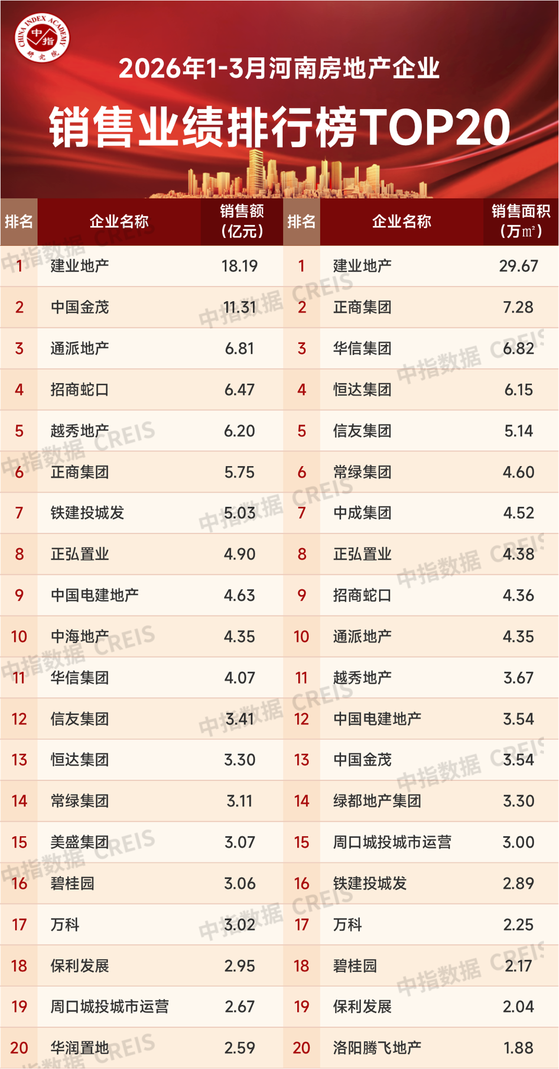 榜单显示,建业地产、中国金茂、通派地产、招商蛇口、越秀地产5家房企销售额位列1~3月河南房地产企业销售业绩榜单前五;建业地产、通派地产、正商集团、铁建投城发、正弘置业5家企业销售额位列河南本土房地产企业销售业绩榜单前五。