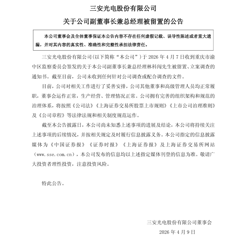 【大河财立方消息】4月8日晚间,三安光电股份有限公司公告称,4月7日该公司收到重庆市渝中区监察委员会签发的关于副董事长兼总经理林科闯被留置、立案调查的通知书。