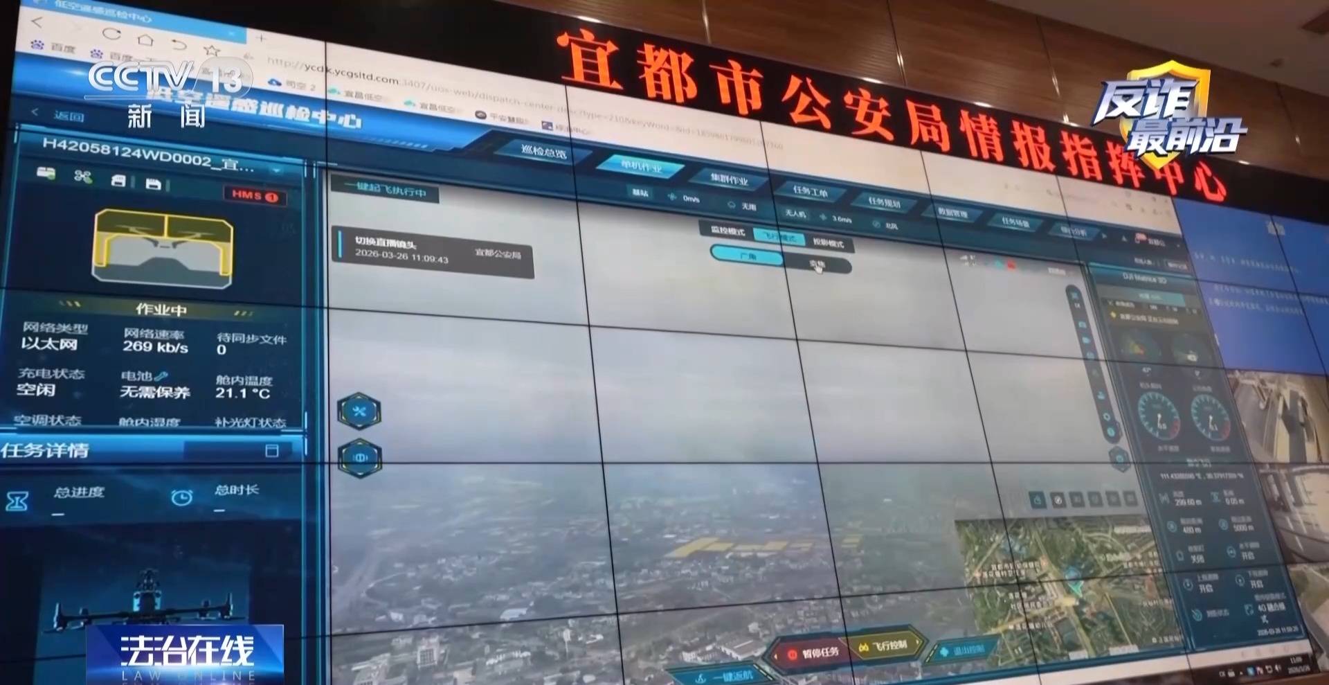 宜都市公安局网络安全保卫大队教导员 吕绍毅:我们一方面快速研判曾先生的行进路线和交易地点,安排地面警力前往现场开展拦截;另一方面同步调度无人机升空,依托无人机高空视角、全域覆盖、实时监控的优势,对目标区域及周边开展了高空巡查。在定位曾先生位置的同时,锁定了两名来取现的“车手”的位置,为地面抓捕提供了实时的精准位置指引和全程动态监控。
