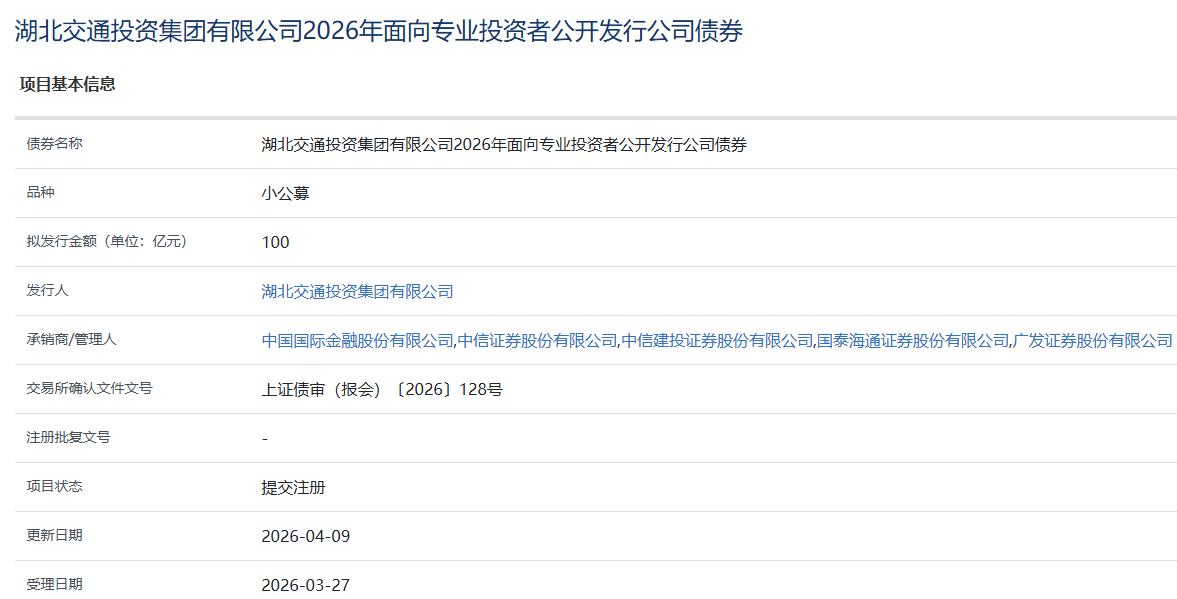 【大河财立方消息】4月9日,上交所债券项目信息平台显示,湖北交通投资集团有限公司2026年面向专业投资者公开发行公司债券项目已提交注册。