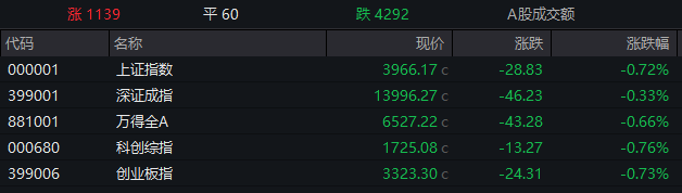 【大河财立方消息】截至4月9日收盘,A股主要指数全线飘绿,上证指数收跌0.72%,创业板指跌0.73%,深证成指跌0.33%,科创综指跌 0.76%。金融科技、AI应用、创新药、商业航天、人形机器人概念股跌幅靠前;算力硬件产业链逆势走强,CPO、光纤、PCB方向领涨。全市场近4300只个股飘绿。