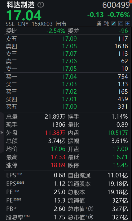 财务报告显示,科达制造2025年实现营收173.89亿元,同比增长38.01%;归母净利润13.09亿元,扣非后归母净利润11.99亿元,分别同比增长30.07%、30.20%。科达制造最新市值327亿元。