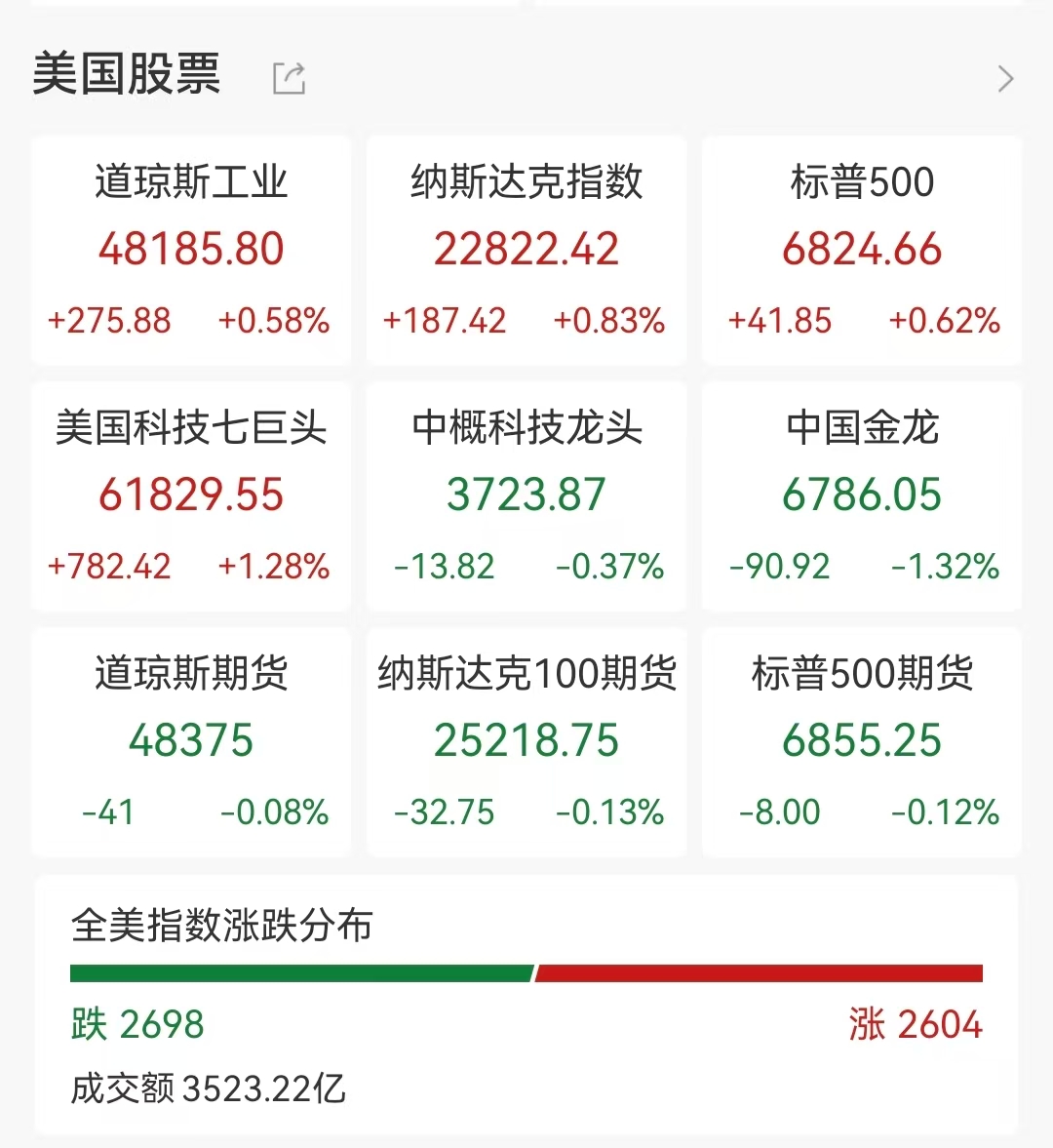 【大河财立方消息】周四(4月9日),美国三大股指全线收涨,道指涨0.58%报48185.8点,标普500指数涨0.62%报6824.66点,纳指涨0.83%报22822.42点。