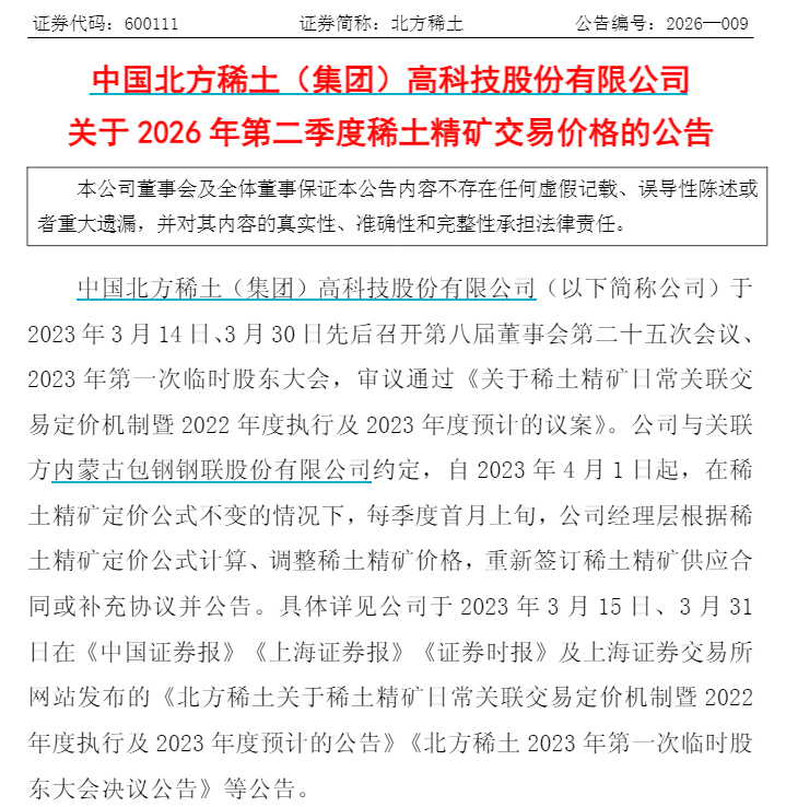 4月10日,包钢股份、北方稀土双双公告,拟将2026年第二季度稀土精矿关联交易价格调整为不含税38804元/吨(干量,REO=50%),REO每增减1%、不含税价格增减766.08元/吨。