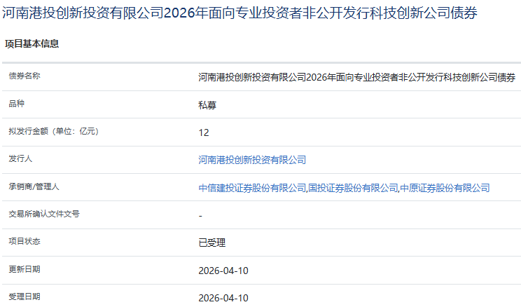 【大河财立方消息】4月10日,河南港投创新投资有限公司2026年面向专业投资者非公开发行科技创新公司债券项目获上交所受理。债券拟发行金额12亿元,承销商/管理人为中信建投、国投证券、中原证券。