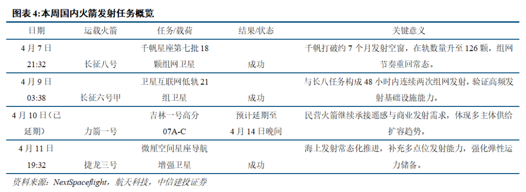 总结:上周国内商业航天完成多次成功发射——计划发射4次,除力箭一号预计延期至14日发射外,其余三次任务均取得圆满成功。4月下旬起,中国商业航天将进入可回收火箭密集验证窗口,核心催化来自长征十号乙预计于4月28日在文昌首飞并同步验证海上网系回收,以及朱雀三号遥二在二季度内再次冲刺一子级回收,单位发射成本降低有望加速商业化进程。此外,各地商业航天政策持续加码,进一步助力产业发展。