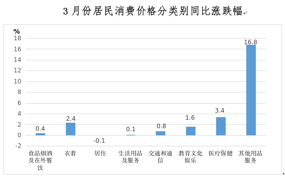其他七大类价格同比六涨一降。其中,其他用品及服务价格上涨16.8%,医疗保健价格上涨3.4%,衣着价格上涨2.4%,教育文化娱乐价格上涨1.6%,交通通信价格上涨0.8%,生活用品及服务价格上涨0.1%;居住价格下降0.1%。