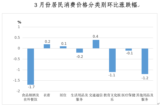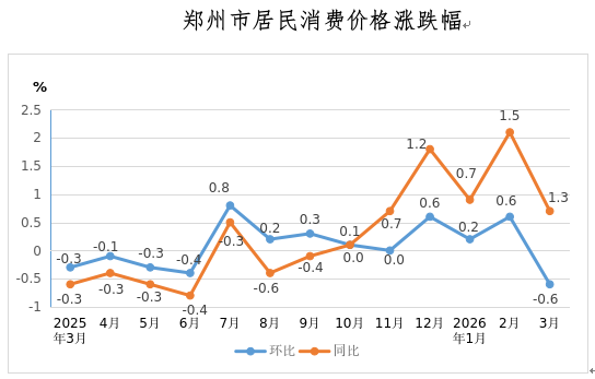 3月份,郑州市居民消费价格环比下降0.6%。其中,食品价格下降3.4%,非食品价格下降0.1%;消费品价格下降0.6%,服务价格下降0.5%。
