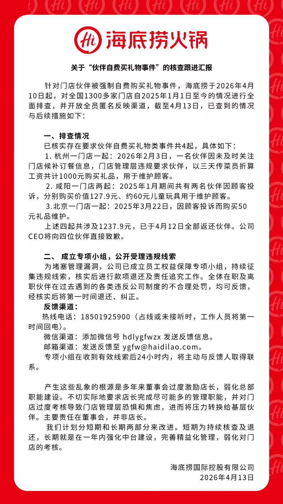 海底捞称,自2026年4月10日起,对全国1300余家门店自2025年1月1日至今的情况进行全面排查,并开放全员匿名反馈渠道。共查实有4起要求门店员工自费买礼物事件,共涉及1237.9元,已于4月12日全部返还给员工。公司CEO将直接向四位员工道歉。