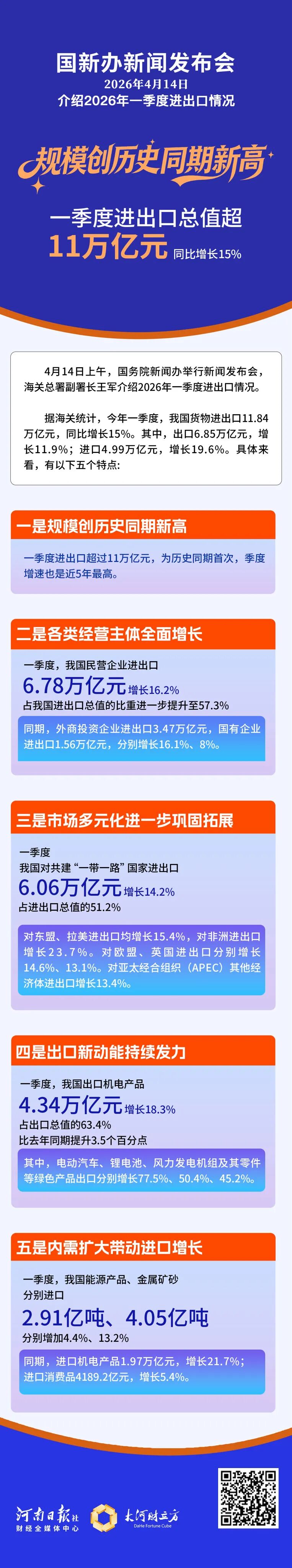 【大河财立方 记者 裴熔熔 陈玉静 北京报道】4月14日上午,国务院新闻办举行新闻发布会,介绍2026年第一季度进出口情况。据海关统计,今年一季度,我国货物贸易进出口11.84万亿元,为历史同期首次超过11万亿元,季度增速也是近五年最高,同比增长15%。其中,出口6.85万亿元,增长11.9%,进口4.99万亿元,增长19.6%。
