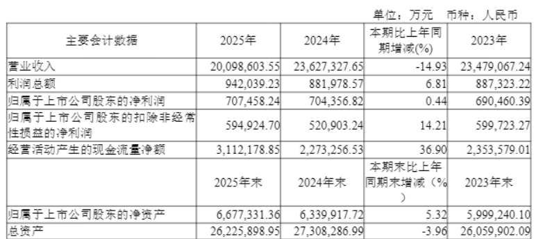 【大河财立方消息】4月14日,恒力石化股份有限公司(简称恒力石化)交出2025年成绩单。2025年度,公司实现营业收入2009.86亿元,同比减少14.93%;实现归属于上市公司股东的净利润70.75亿元,较上年同期增加0.44%。