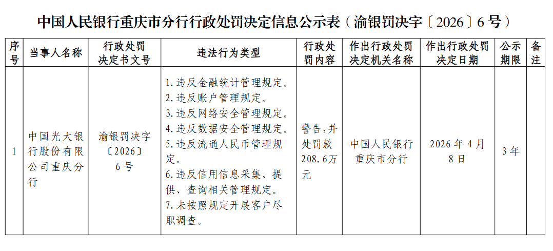 【大河财立方消息】4月14日,中国人民银行重庆市分行披露的行政处罚决定信息公示表显示,中国光大银行股份有限公司重庆分行因存在7项违法行为,被给予警告并处罚款208.6万元。