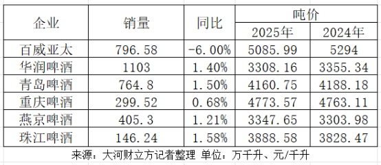 2025年度,华润啤酒、百威亚太、青岛啤酒、燕京啤酒、重庆啤酒、珠江啤酒的销量分别为1103万千升、796.58万千升、765万千升、405.3万千升、299.52万千升、146.24万千升。除百威亚太外,其他企业销量均有微增。
