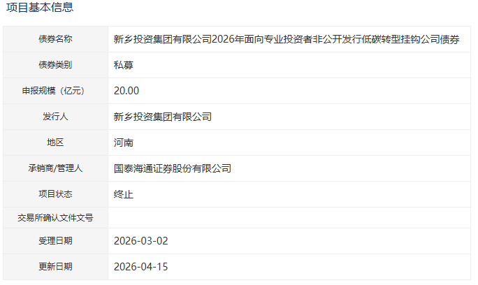 【大河财立方消息】4月16日消息,深交所固定收益信息平台显示,“新乡投资集团有限公司2026年面向专业投资者非公开发行低碳转型挂钩公司债券”项目状态更新为终止。