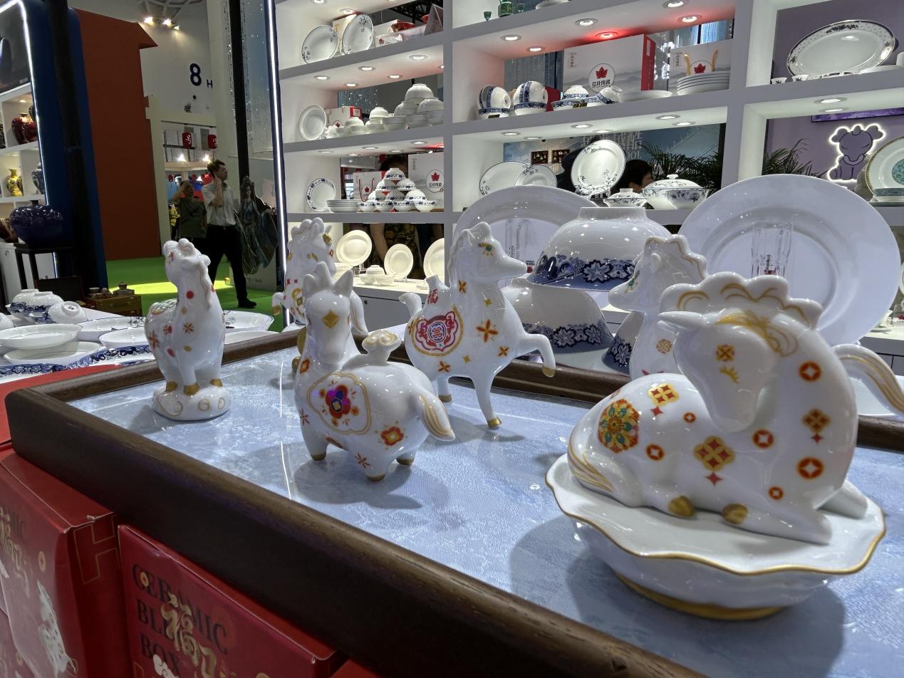 景德镇多家代表性企业在八号馆景德镇制瓷展区参展。对现场游客而言,尽管瓷器并不陌生,但最新展示的产品与服务,如非遗瓷器艺术品、传统手工茶器、现代日用陶瓷等,仍然吸引他们驻足。
