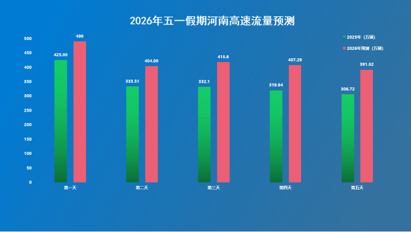 4月21日,河南交通运输部门发布假期河南高速出行提示。根据预测,今年五一假期将呈现探亲流、旅游流、学生流“三流叠加”态势。预计今年五一期间,全省高速公路出口总流量将达到2100万辆左右,较2025年同比增长10%,日均流量约420万辆,为日常日均流量的2.5倍。其中5月1日单日流量将迎来假期峰值,预计突破490万辆。