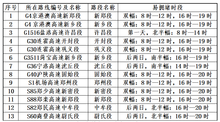 预测可能出现拥堵的路段有:机场高速郑州段、京港澳高速新郑段、京港澳高速新乡段、连霍高速开封段、郑少高速新密段、郑民高速中牟段等。
