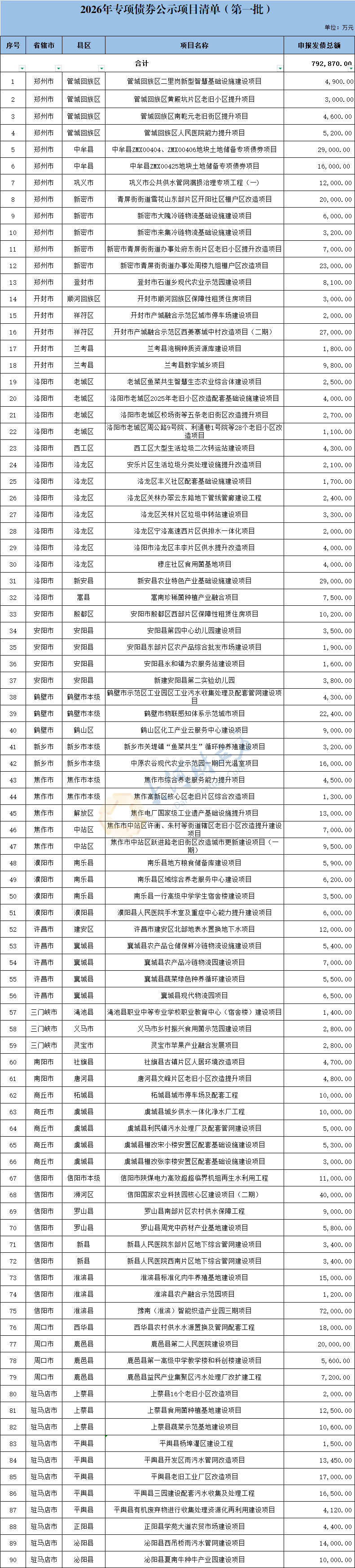 【大河财立方消息】4月22日,河南省财政厅公示2026年第一批通过发行资料评审的专项债券项目。本次公示涉及评审通过项目90个,申报发债总额为79.287亿元。公示时间为2026年4月22日-2026年4月26日。