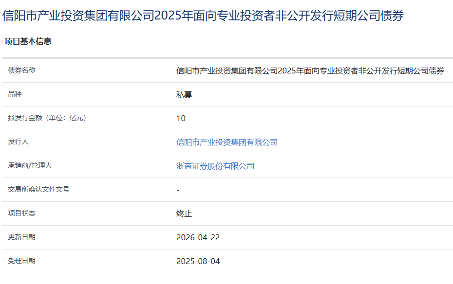 【大河财立方消息】据上交所4月22日消息,信阳市产业投资集团有限公司2025年面向专业投资者非公开发行短期公司债券项目状态更新为“终止”。该债券拟发行金额10亿元,承销商/管理人为浙商证券。