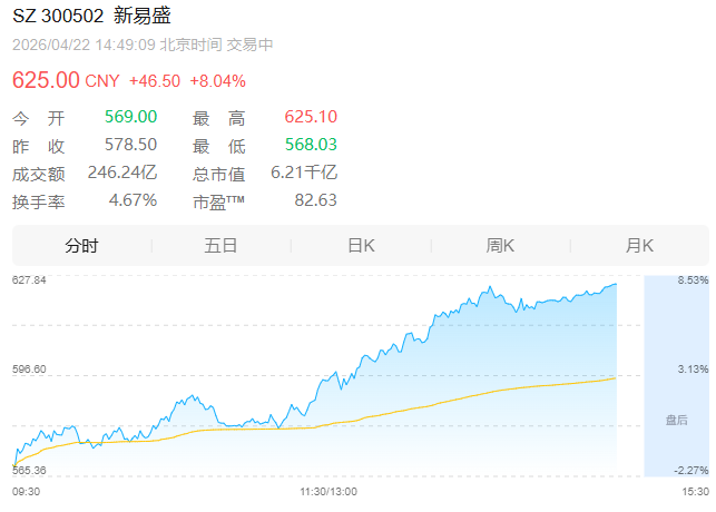【大河财立方消息】4月22日,光通信产业链再度爆发,光模块(CPO)指数暴涨5.2%。三大龙头股“易中天”(中际旭创、新易盛、天孚通信)盘中集体拉升,截至发稿成交额合计超647亿元,总市值超贵州茅台。