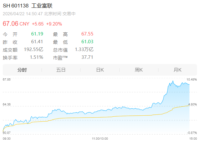 此外,万亿龙头工业富联盘中持续拉升,触及涨停价67.55元,后稍有回落。