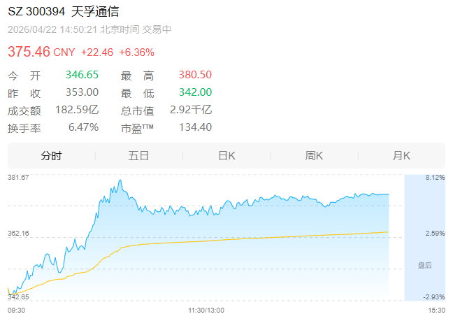 天孚通信盘中涨超6%,最高报380.5元,距离股价最高点388.94元仅一步之遥,市值超2900亿元。