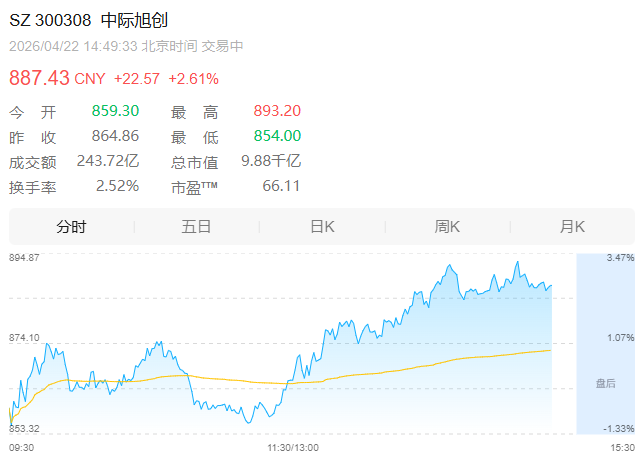中际旭创盘中涨超3%,最高触及893.20元,同创历史新高,总市值逼近万亿大关,达9910亿元。