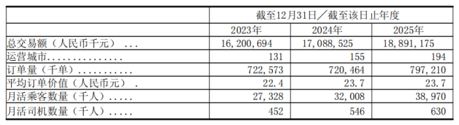 尽管总交易额和订单量有所增长,但从增速来看,T3出行表现不及曹操出行、如祺出行。2025年,该公司总交易额同比增速为10.55%,同期,曹操出行、如祺出行的同比增速为38.19%和115.71%。