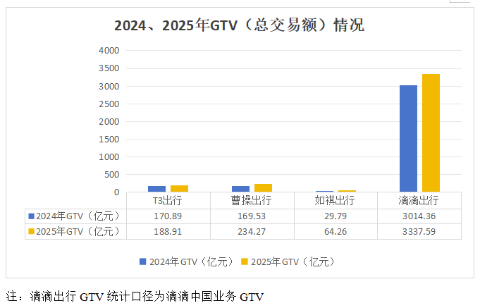 2025年,中国网约车市场进一步分化,整体来看,相较于2024年,四家网约车企业总交易额均实现增长。