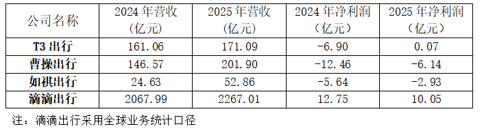 2025年,T3出行的净利润虽仅有0.07亿元,但相较于2024年,T3出行已成功实现扭亏为盈,而同时期的曹操出行和如祺出行尚处于亏损状态。