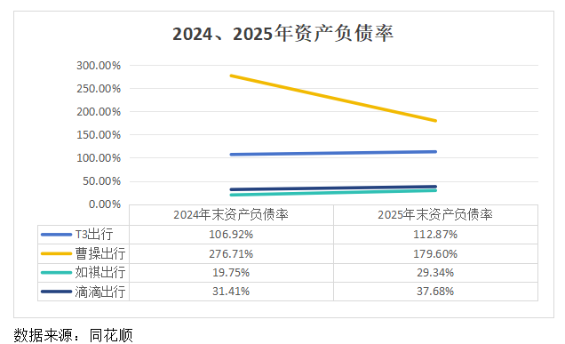 长期偿债能力方面,2025年,T3出行的资产负债率超过100%且呈上升态势,远高于如祺出行和滴滴出行。