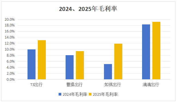 毛利率表现方面,2025年,T3出行的毛利率为13.0%,较2024年的10.0%提升3个百分点,虽低于龙头企业滴滴出行的19.2%,但高于同时期曹操出行的9.4%和如祺出行的11.9%。