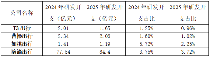 然而,从研发投入来看,2025年,T3出行的研发开支金额虽与曹操出行和如祺出行接近,但在四家企业中,T3出行研发开支占比最低,研发开支占收入比例降至1%以下。