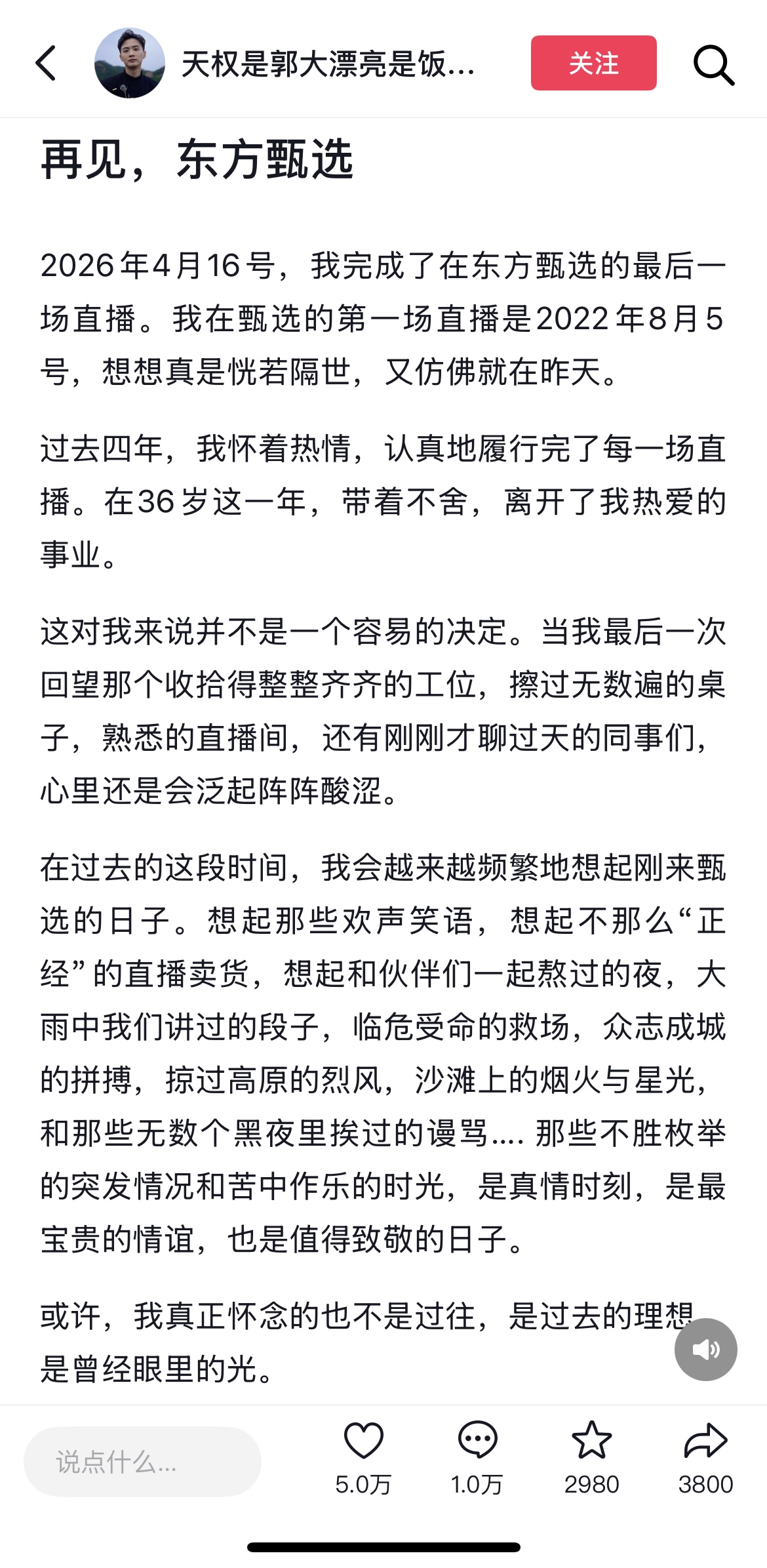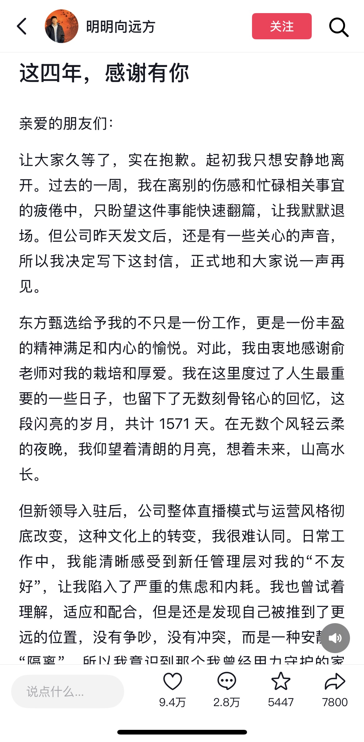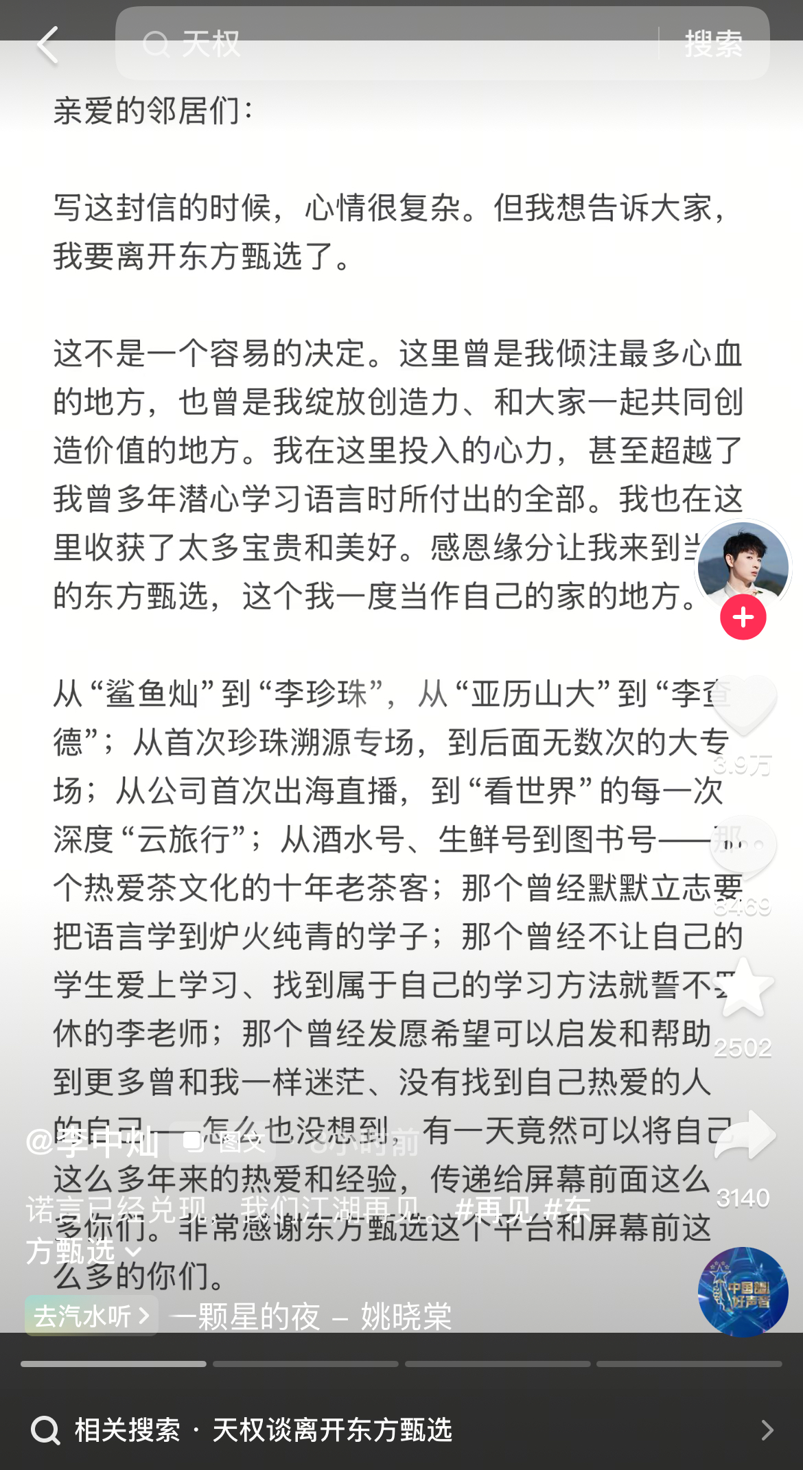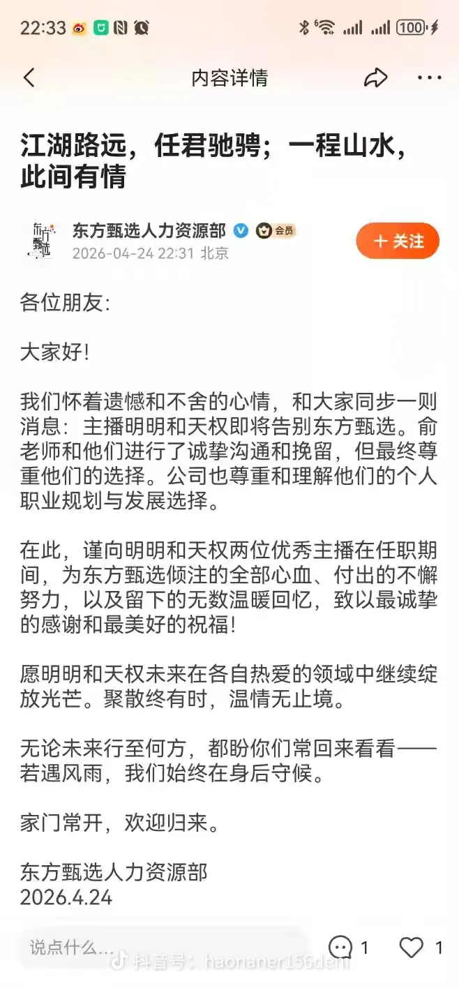 4月24日晚间,东方甄选人力资源部发文称:“我们怀着遗憾和不舍的心情,和大家同步一则消息:主播明明和天权即将告别东方甄选。俞老师和他们进行了诚挚沟通和挽留,但最终尊重他们的选择。”