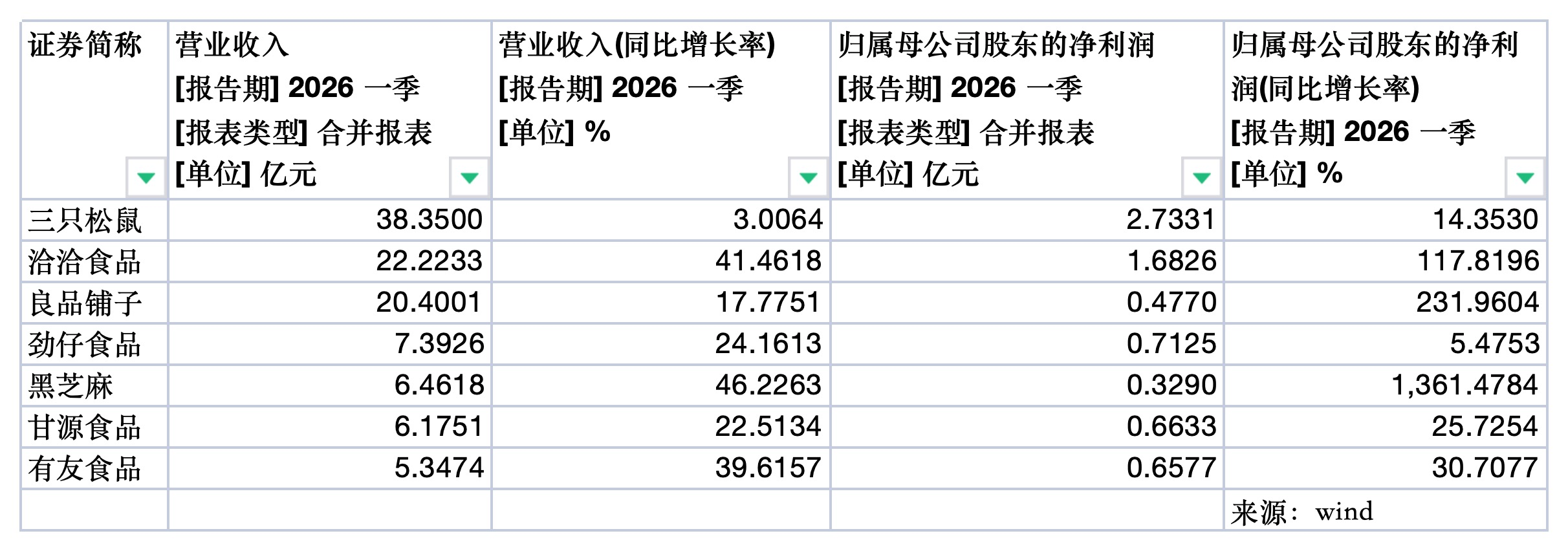 值得注意的是,良品铺子的良好表现并非个例。截至4月28日,休闲零食行业已有7家A股企业披露2026年第一季度报告。大河财立方记者梳理A股休闲零食企业的2026年第一季度经营数据发现,多家休闲零食企业营收、归母净利润在今年第一季度双双实现同比增长。