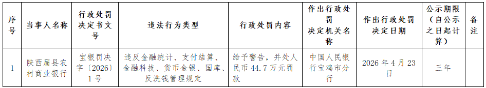 【大河财立方消息】4月29日,中国人民银行宝鸡市分行披露的行政处罚决定信息显示,因违反金融统计、支付结算、金融科技、货币金银、国库、反洗钱管理规定,陕西眉县农村商业银行被警告,并处44.7万元罚款。